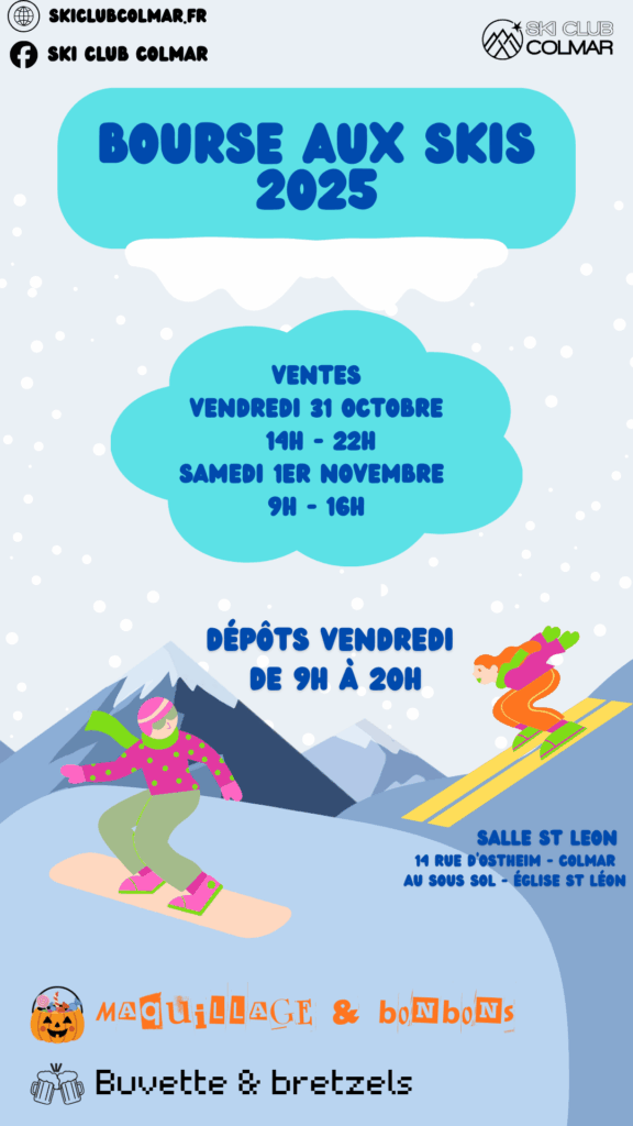 Les bénévoles du Ski Club Colmar vous accueilleront à partir du vendredi 31 octobre à 9h pour réceptionner le matériel que vous souhaitez mettre en vente.